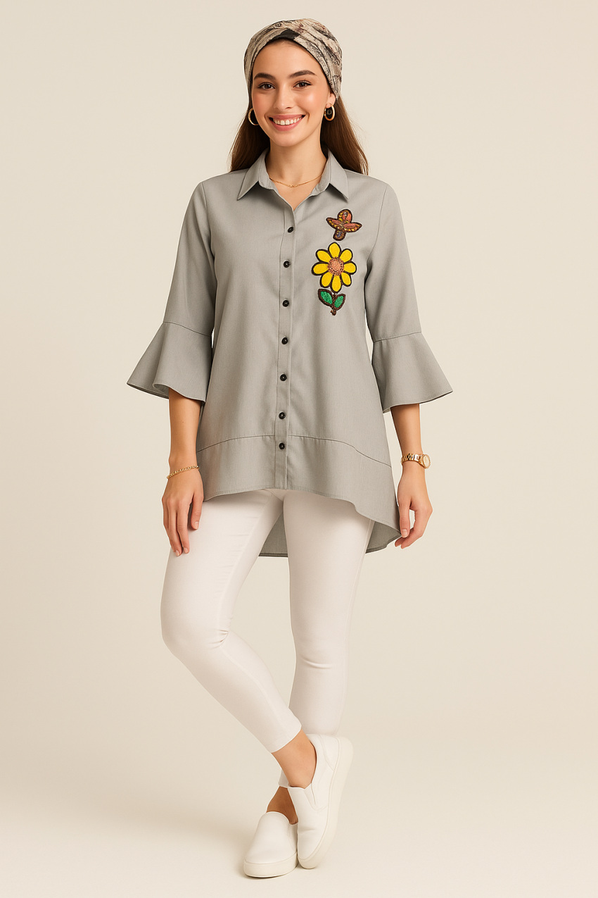 شومیز کلاسیک جلودکمه آستین کلوش جلوهای بسیار زنانه و کلاسیک به استایل میبخشد.
